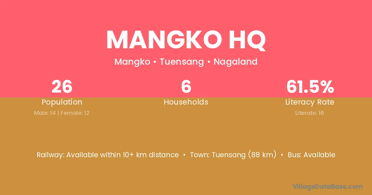 Mangko Hq village has a total population of 26 people, of which 14 are males and 12 are females.