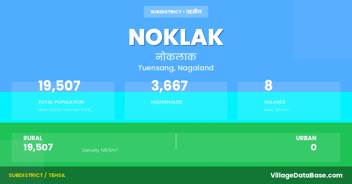Noklak is a town and Circle in the Tuensang district of the Nagaland. In India, a Circle is a subdivision of a district responsible for the administration and revenue collection of a specific area within the district. Circles play a crucial role in the local governance structure, contributing significantly to the development and administration of their communities.