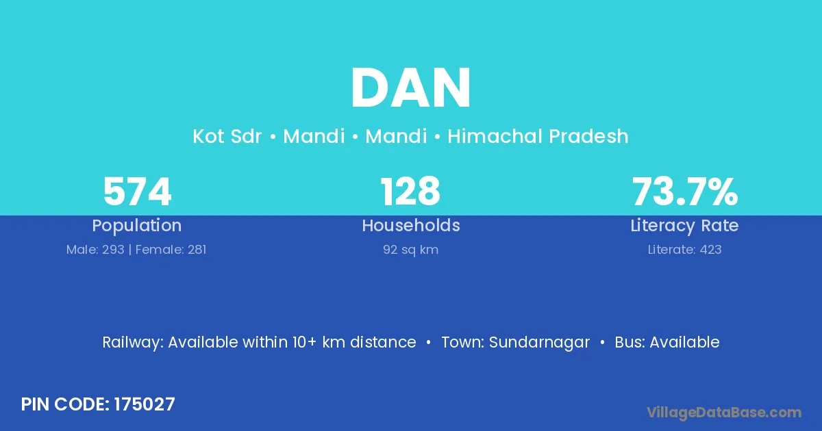 The literacy rate of Dan village is 37.89%. Male literacy stands at 38.81% and female literacy at 36.60%.