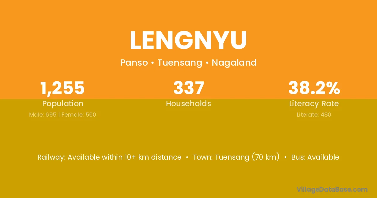 Tuensang (70 km) is the nearest town to Lengnyu village for major economic activities and is located approximately 70 km away.