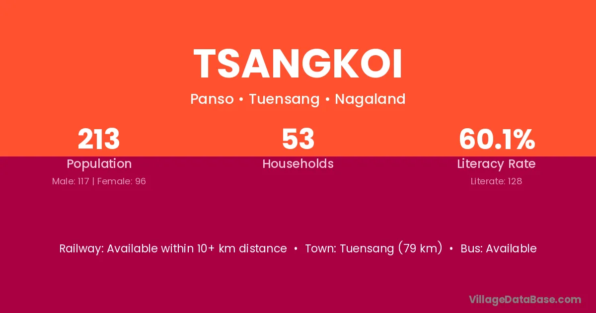 Tsangkoi village has a total population of 213 people, of which 117 are males and 96 are females.
