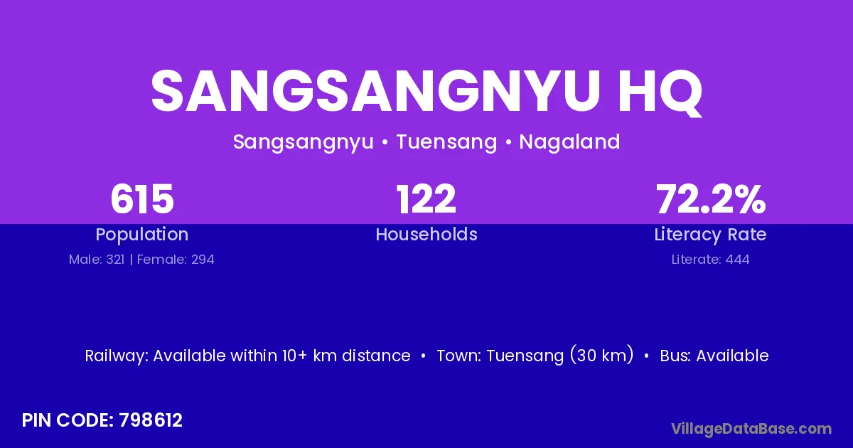 Tuensang (30 km) is the nearest town to Sangsangnyu Hq village for major economic activities and is located approximately 30 km away.
