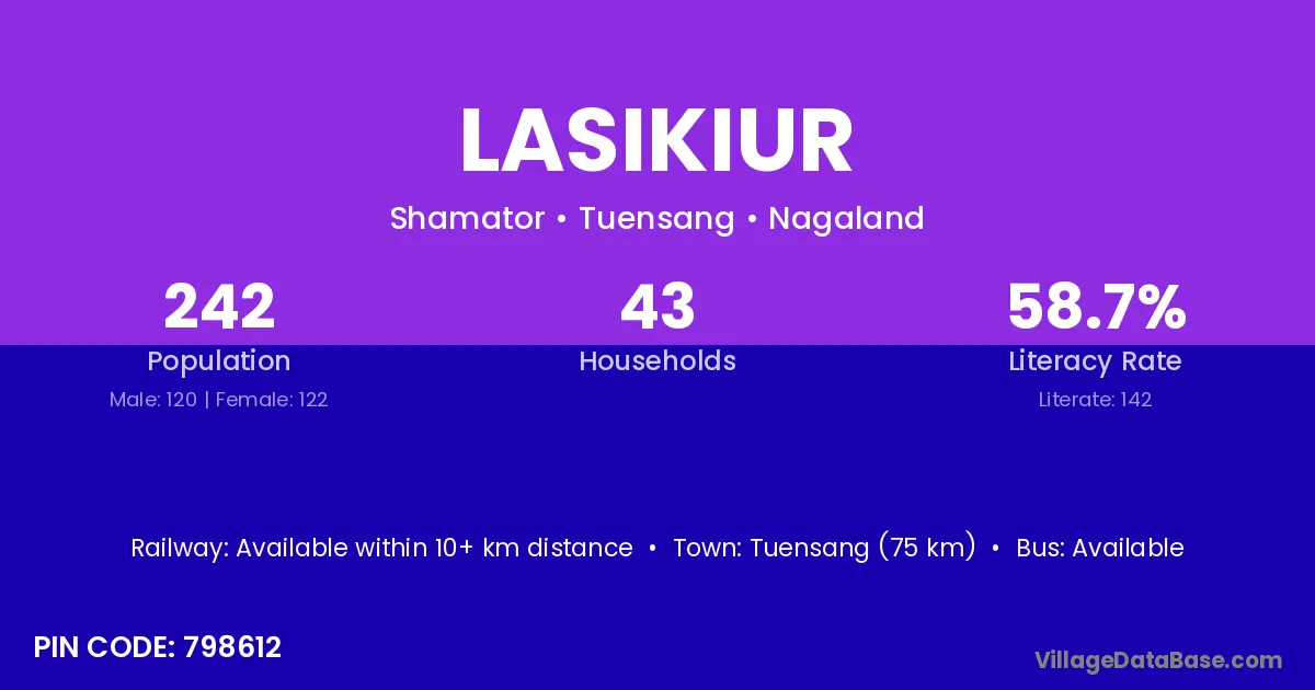 Tuensang (75 km) is the nearest town to Lasikiur village for major economic activities and is located approximately 75 km away.