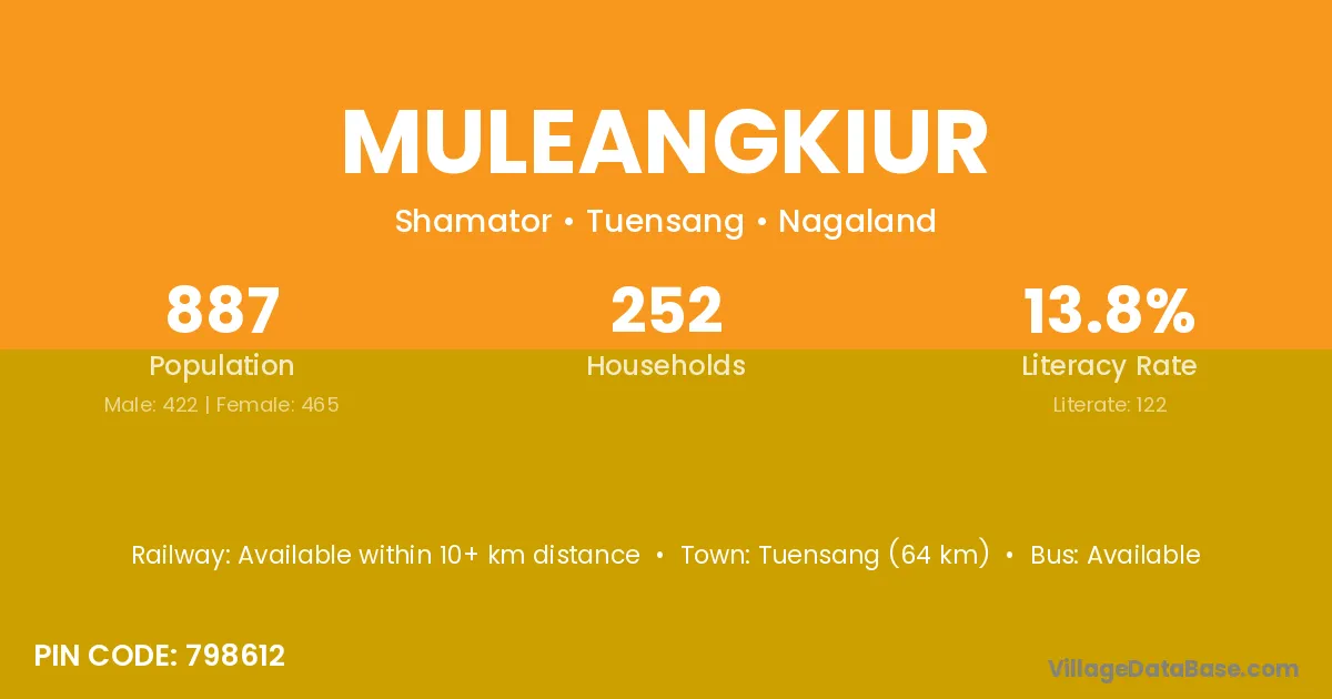 Tuensang (64 km) is the nearest town to Muleangkiur village for major economic activities and is located approximately 64 km away.