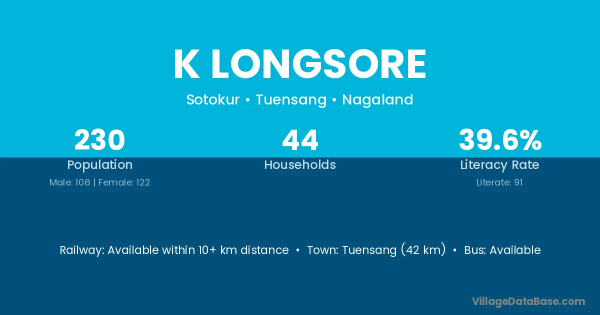 Tuensang (42 km) is the nearest town to K Longsore village for major economic activities and is located approximately 42 km away.