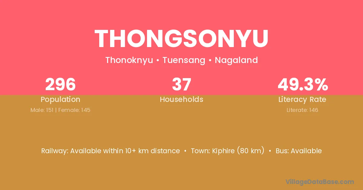 Thongsonyu village has a total population of 296 people, of which 151 are males and 145 are females.