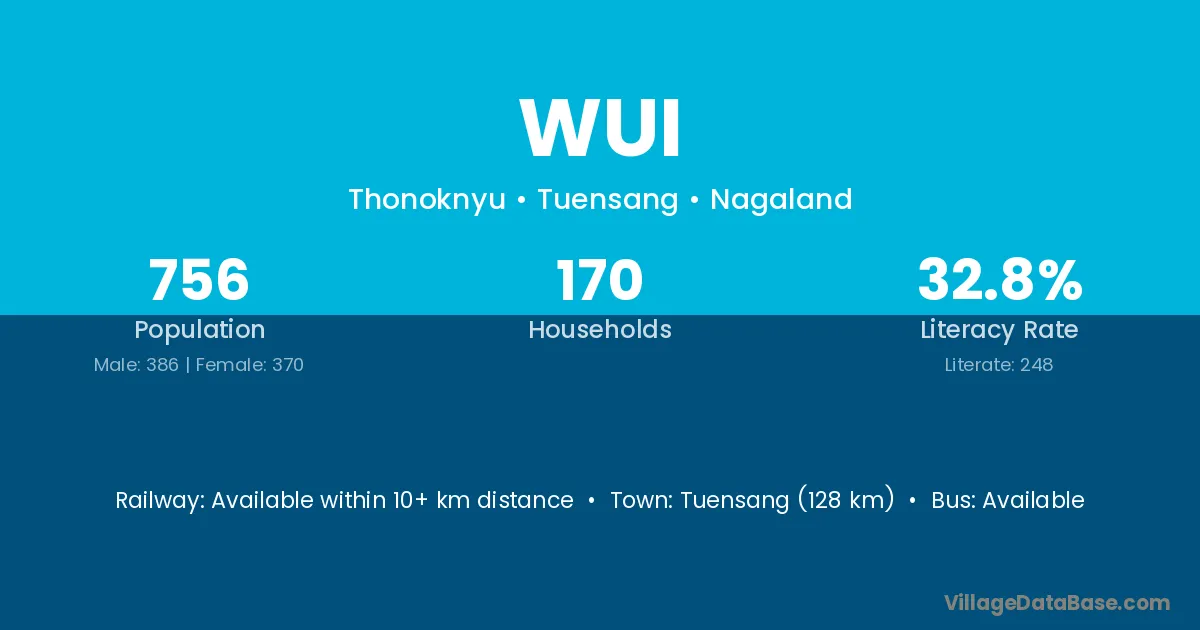 Tuensang (128 km) is the nearest town to Wui village for major economic activities and is located approximately 128 km away.