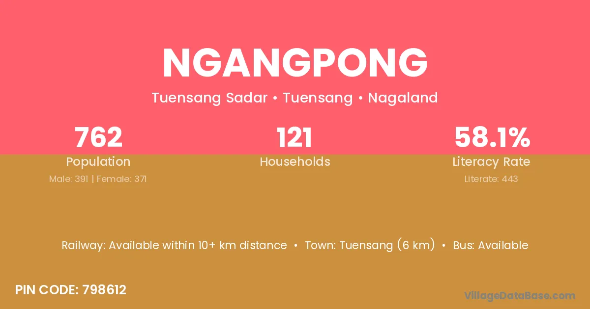 Tuensang (6 km) is the nearest town to Ngangpong village for major economic activities and is located approximately 6 km away.