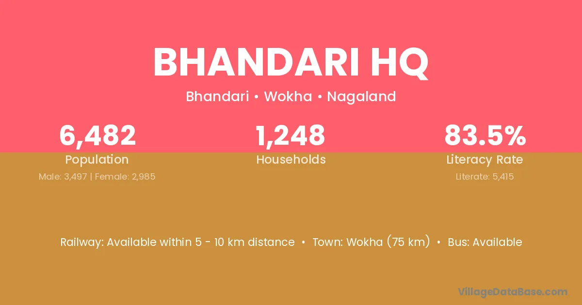 Wokha (75 km) is the nearest town to Bhandari Hq village for major economic activities and is located approximately 75 km away.