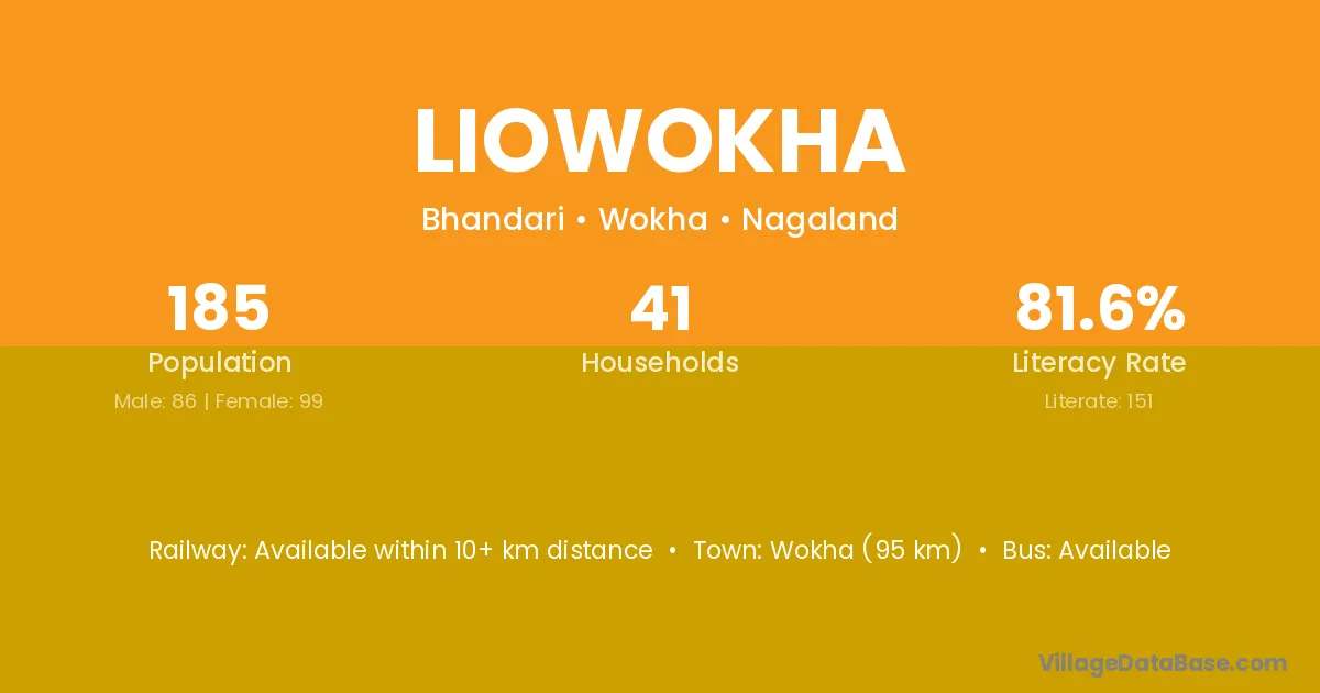 Liowokha village has a total population of 185 people, of which 86 are males and 99 are females.