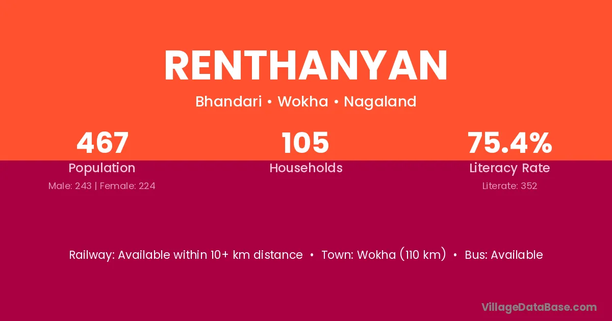 Renthanyan village has a total population of 467 people, of which 243 are males and 224 are females.