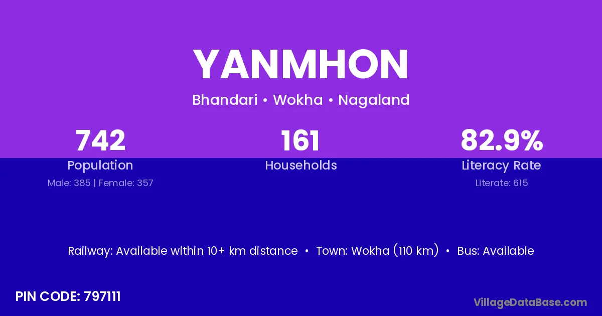 Wokha (110 km) is the nearest town to Yanmhon village for major economic activities and is located approximately 110 km away.