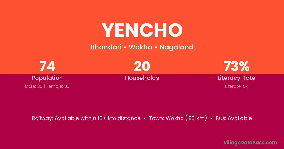 Yencho village has a total population of 74 people, of which 38 are males and 36 are females.