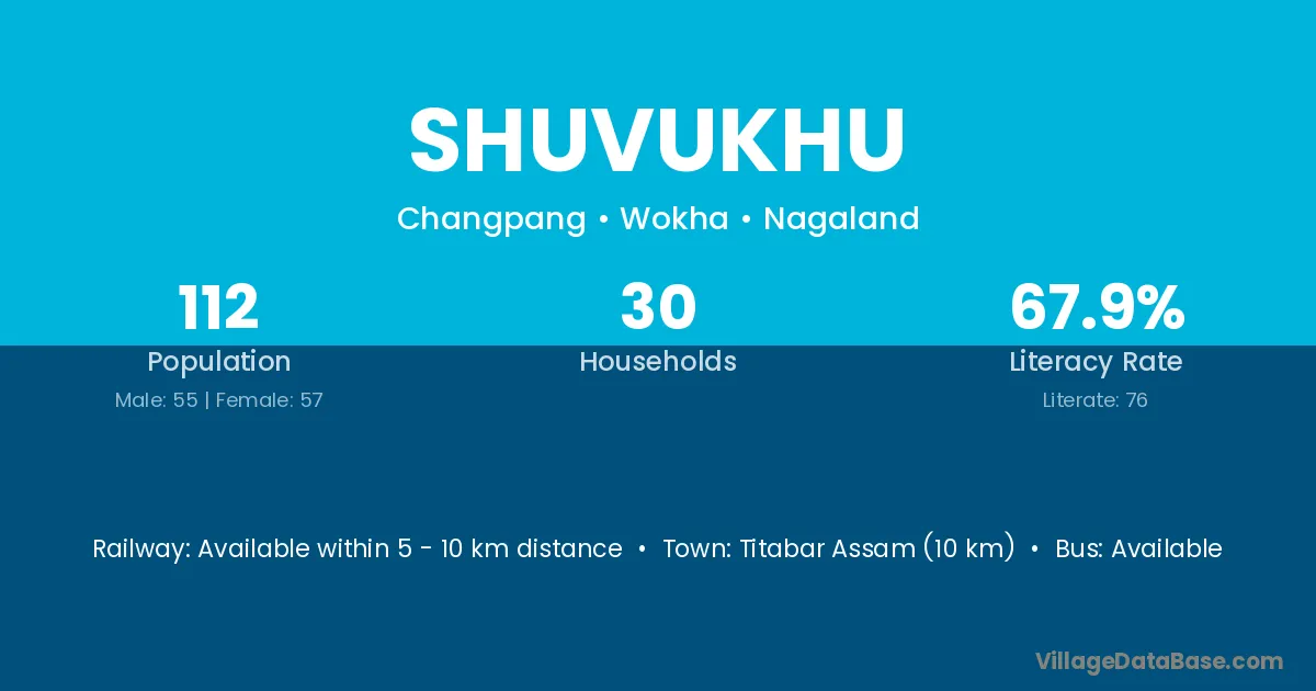 Shuvukhu village has a total population of 112 people, of which 55 are males and 57 are females.