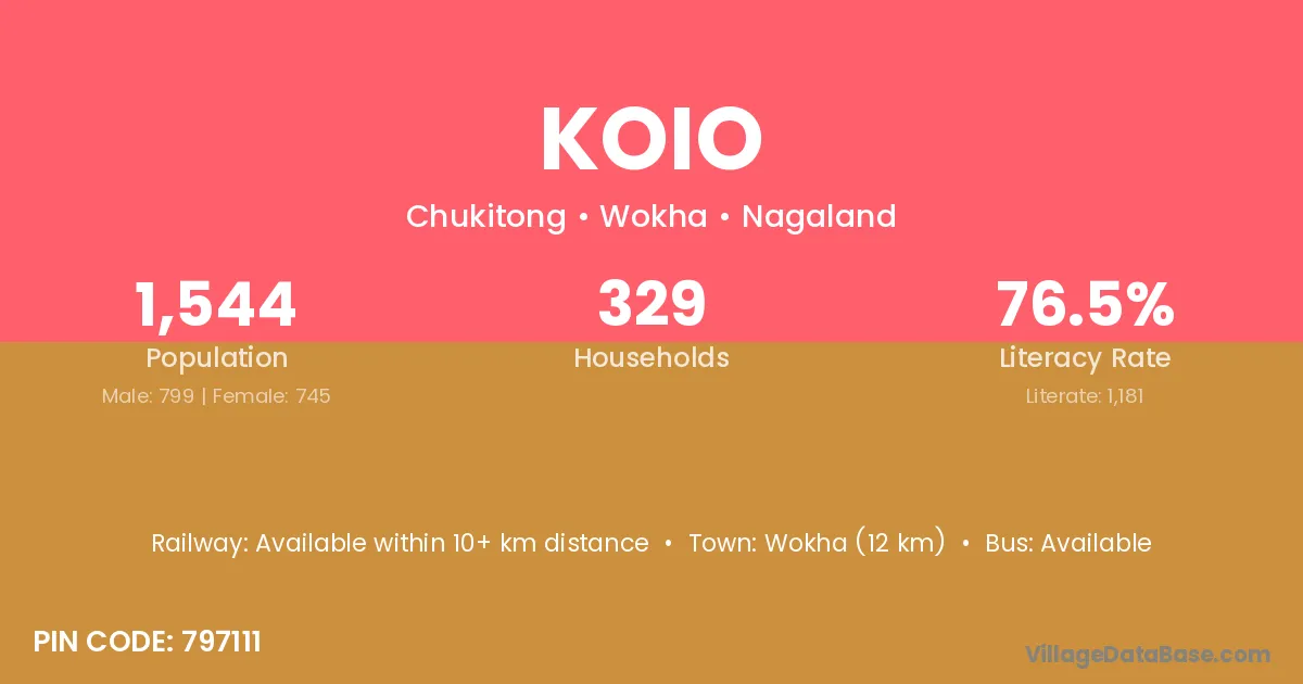 Wokha (12 km) is the nearest town to Koio village for major economic activities and is located approximately 12 km away.