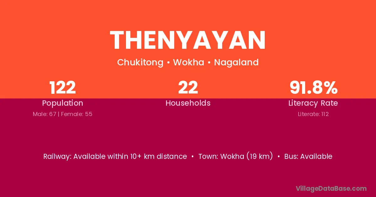 Wokha (19 km) is the nearest town to Thenyayan village for major economic activities and is located approximately 19 km away.