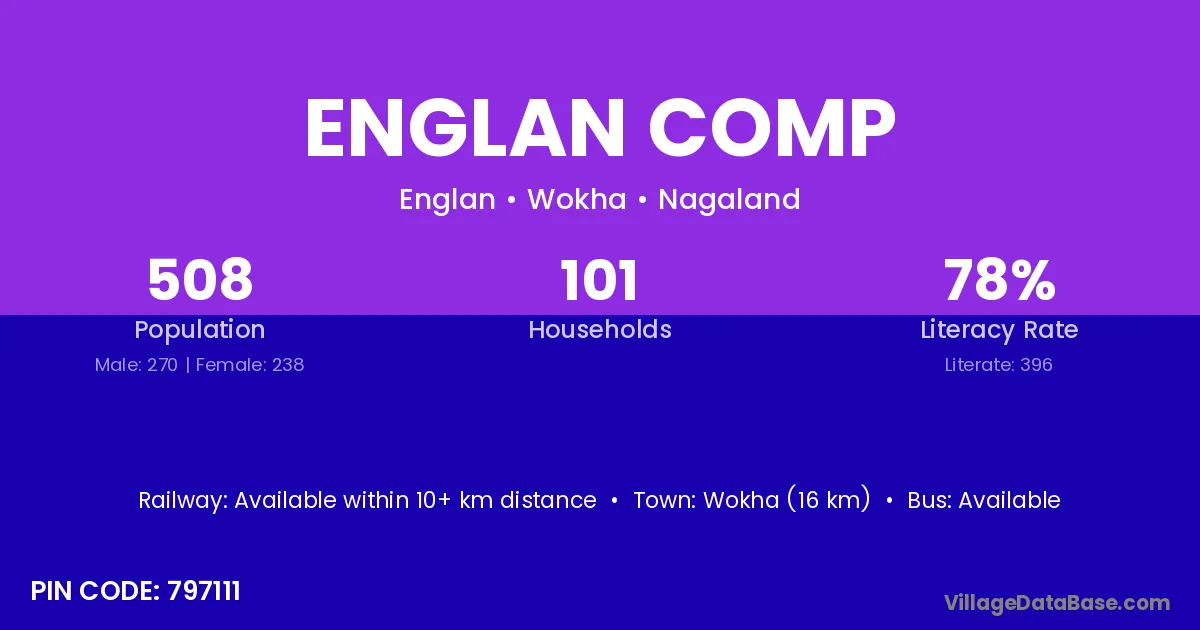 Wokha (16 km) is the nearest town to Englan Comp village for major economic activities and is located approximately 16 km away.