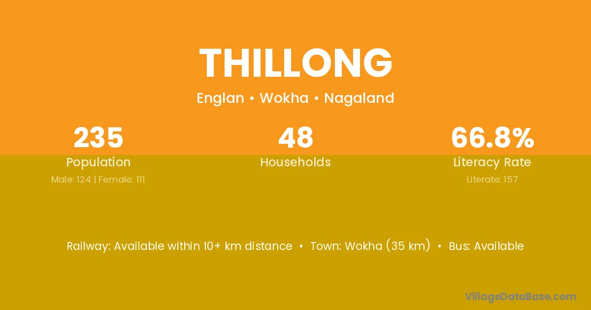 Wokha (35 km) is the nearest town to Thillong village for major economic activities and is located approximately 35 km away.