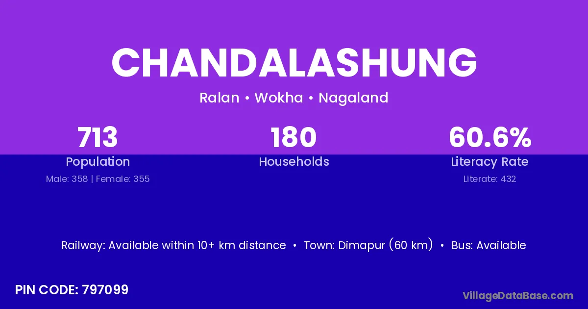 Dimapur (60 km) is the nearest town to Chandalashung village for major economic activities and is located approximately 60 km away.