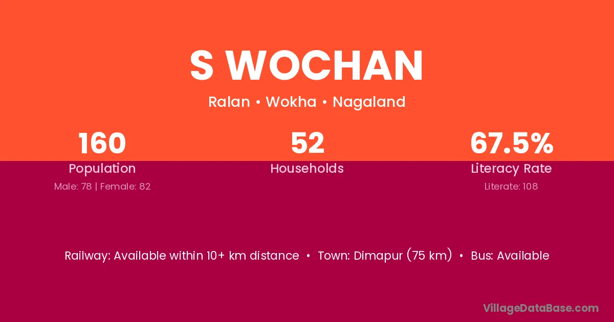 Dimapur (75 km) is the nearest town to S Wochan village for major economic activities and is located approximately 75 km away.