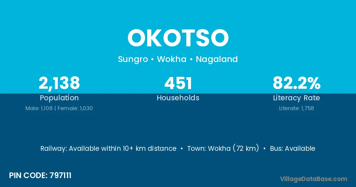 Wokha (72 km) is the nearest town to Okotso village for major economic activities and is located approximately 72 km away.