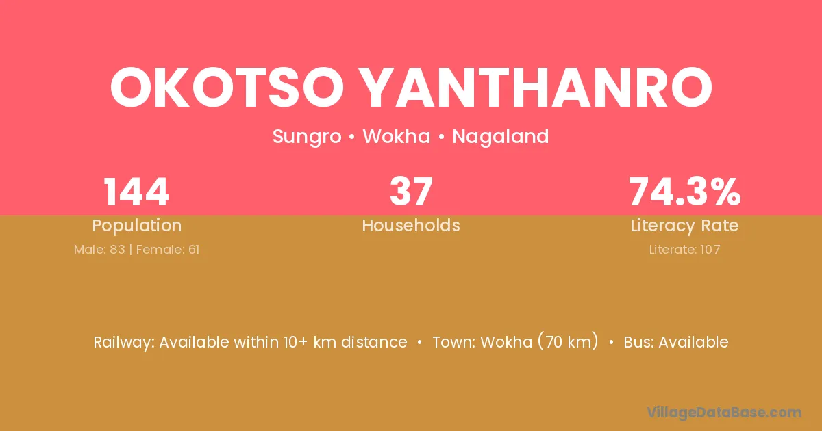 Okotso Yanthanro village has a total population of 144 people, of which 83 are males and 61 are females.