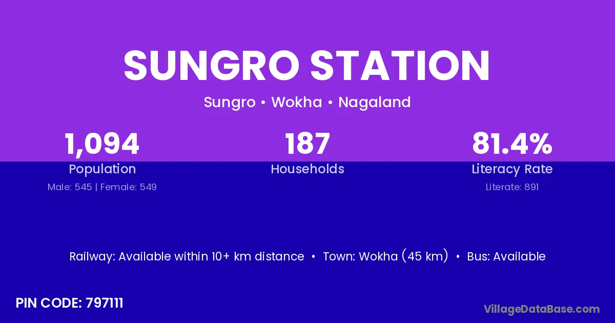 Wokha (45 km) is the nearest town to Sungro Station village for major economic activities and is located approximately 45 km away.