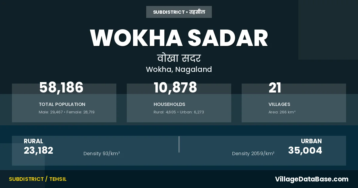 According to the 2011 census The total area of Wokha Sadar Circle is 266 km², with a population of 58186 people. The population density is 219 inhabitants per square kilometre, and there are approximately 10878 houses in the sub district.