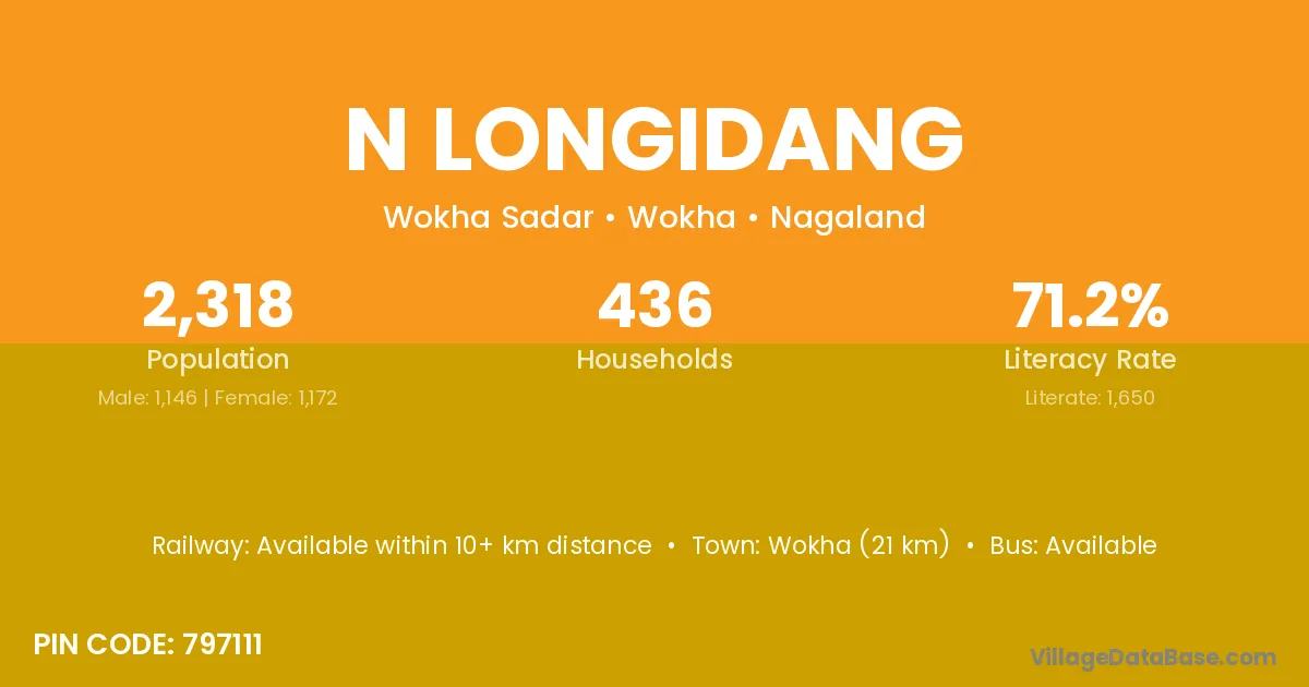 Wokha (21 km) is the nearest town to N Longidang village for major economic activities and is located approximately 21 km away.