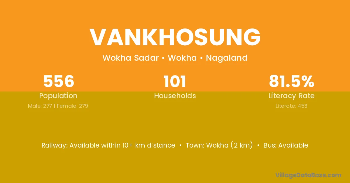 Wokha (2 km) is the nearest town to Vankhosung village for major economic activities and is located approximately 2 km away.