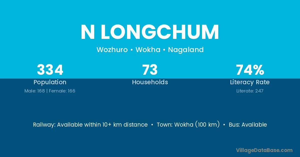 Wokha (100 km) is the nearest town to N Longchum village for major economic activities and is located approximately 100 km away.