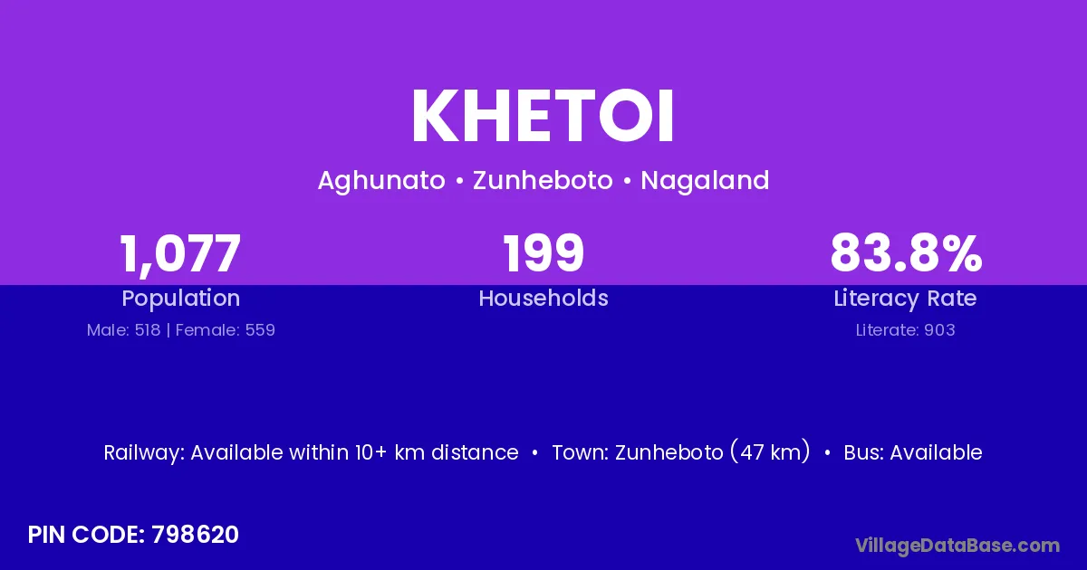 Zunheboto (47 km) is the nearest town to Khetoi village for major economic activities and is located approximately 47 km away.