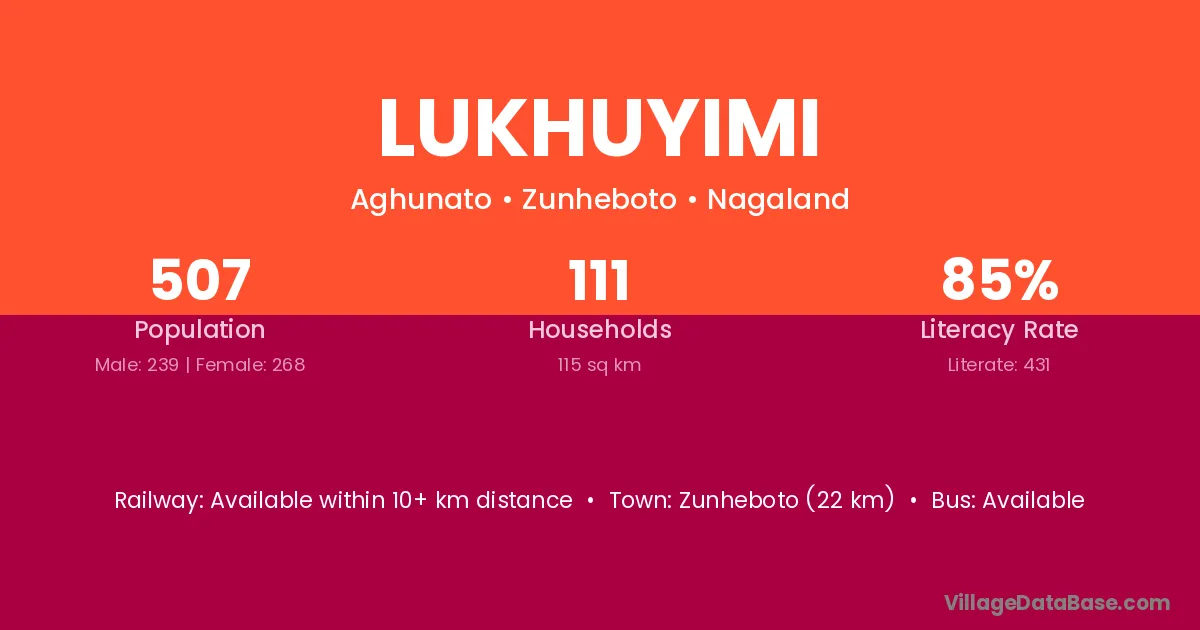 Zunheboto (22 km) is the nearest town to Lukhuyimi village for major economic activities and is located approximately 22 km away.