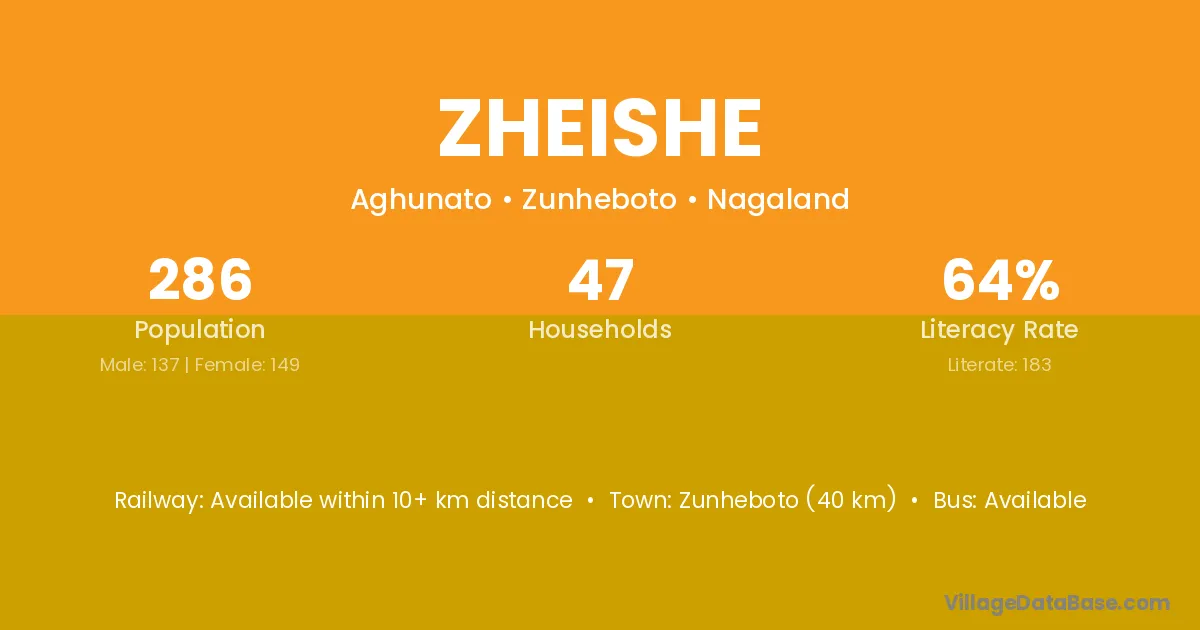 Zunheboto (40 km) is the nearest town to Zheishe village for major economic activities and is located approximately 40 km away.