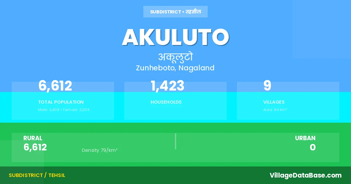 Akuluto is a town and Circle in the Zunheboto district of the Nagaland. In India, a Circle is a subdivision of a district responsible for the administration and revenue collection of a specific area within the district. Circles play a crucial role in the local governance structure, contributing significantly to the development and administration of their communities.