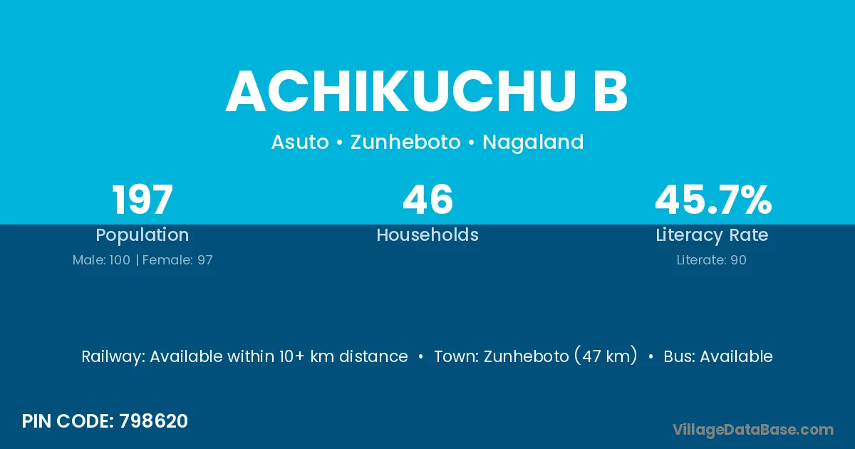 Zunheboto (47 km) is the nearest town to Achikuchu B village for major economic activities and is located approximately 47 km away.