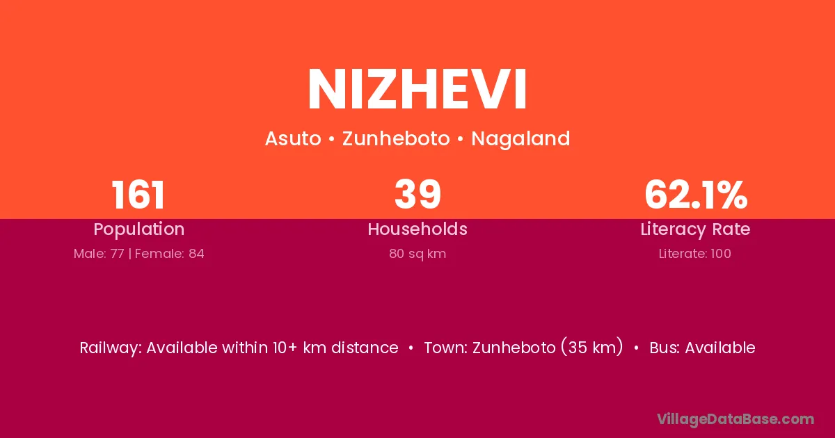 Zunheboto (35 km) is the nearest town to Nizhevi village for major economic activities and is located approximately 35 km away.