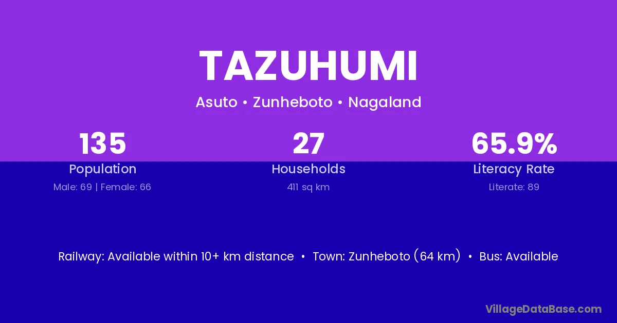 Tazuhumi village has a total population of 135 people, of which 69 are males and 66 are females.