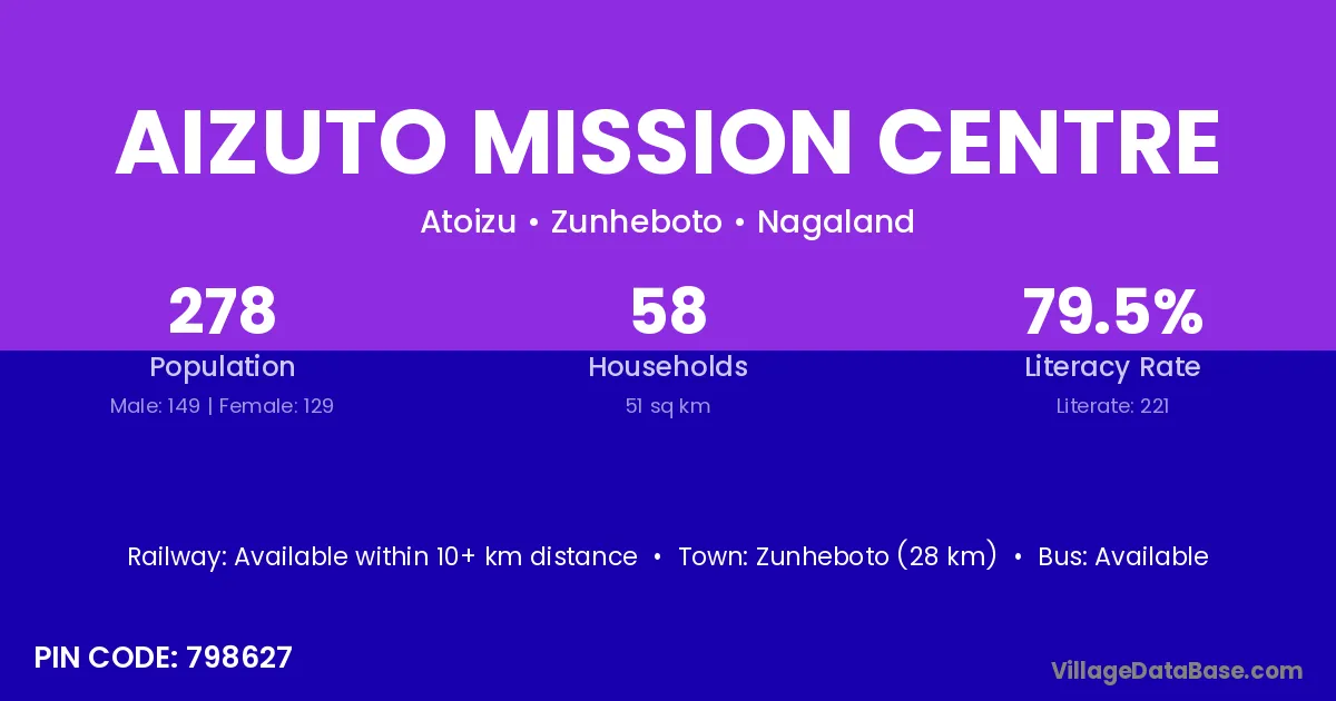 Aizuto Mission Centre village has a total population of 278 people, of which 149 are males and 129 are females.