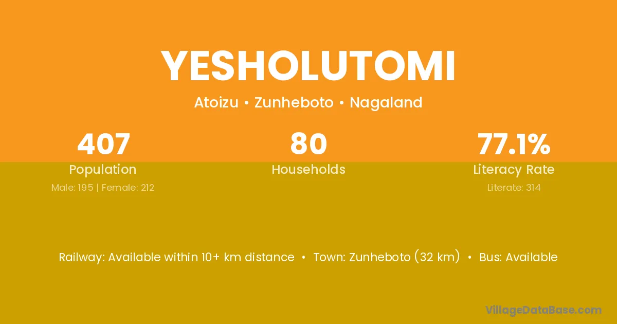 Zunheboto (32 km) is the nearest town to Yesholutomi village for major economic activities and is located approximately 32 km away.