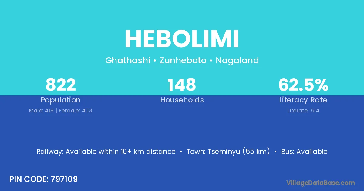 Tseminyu (55 km) is the nearest town to Hebolimi village for major economic activities and is located approximately 55 km away.
