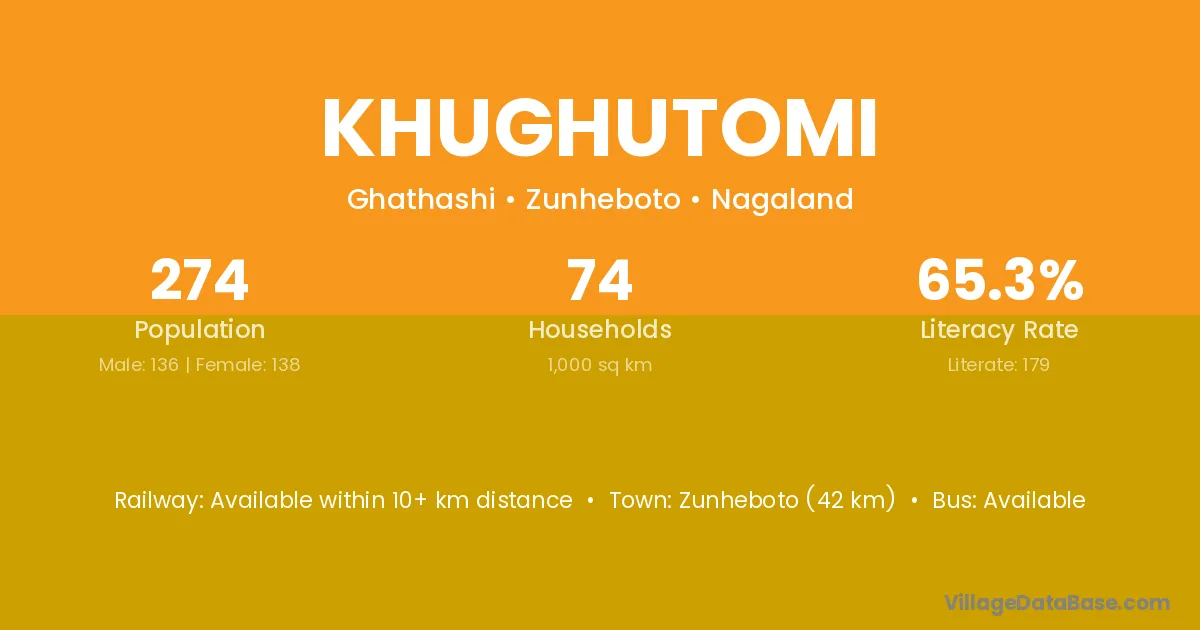 Zunheboto (42 km) is the nearest town to Khughutomi village for major economic activities and is located approximately 42 km away.