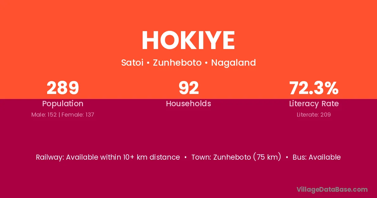 Zunheboto (75 km) is the nearest town to Hokiye village for major economic activities and is located approximately 75 km away.