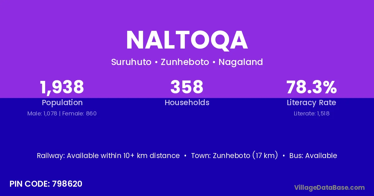 Zunheboto (17 km) is the nearest town to Naltoqa village for major economic activities and is located approximately 17 km away.
