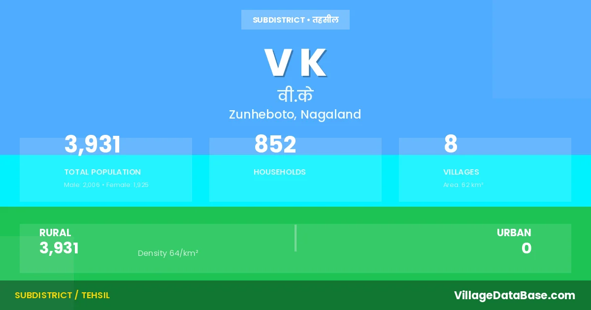 V K is a town and Circle in the Zunheboto district of the Nagaland. In India, a Circle is a subdivision of a district responsible for the administration and revenue collection of a specific area within the district. Circles play a crucial role in the local governance structure, contributing significantly to the development and administration of their communities.