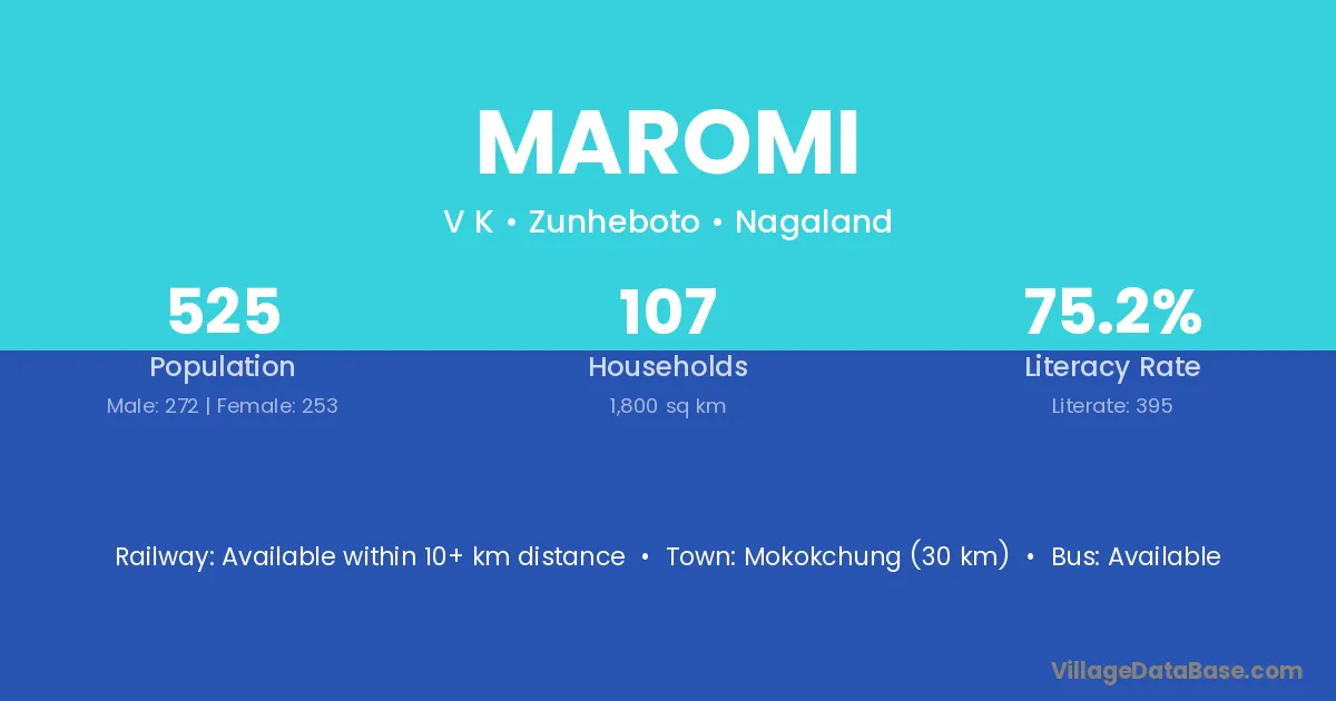 Mokokchung (30 km) is the nearest town to Maromi village for major economic activities and is located approximately 30 km away.