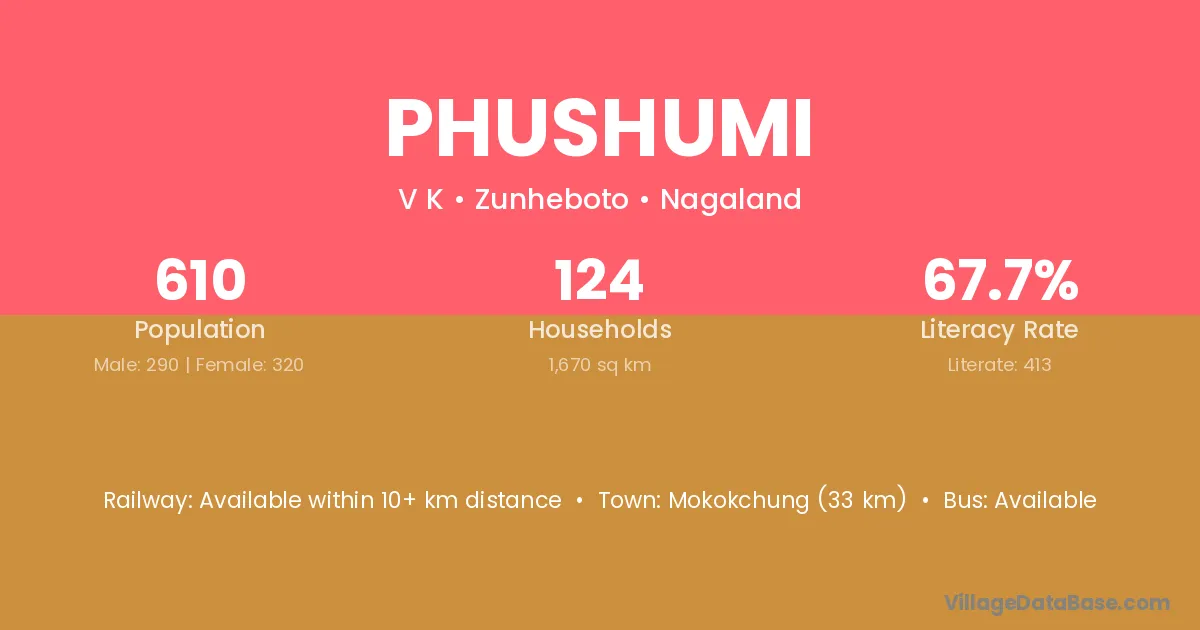 Mokokchung (33 km) is the nearest town to Phushumi village for major economic activities and is located approximately 33 km away.