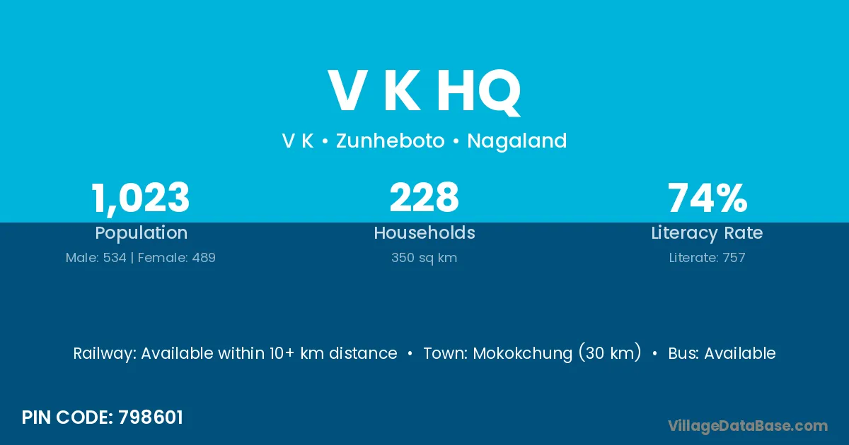 Mokokchung (30 km) is the nearest town to V K Hq village for major economic activities and is located approximately 30 km away.