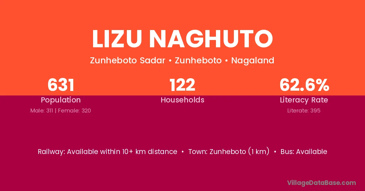 Zunheboto (1 km) is the nearest town to Lizu Naghuto village for major economic activities and is located approximately 1 km away.