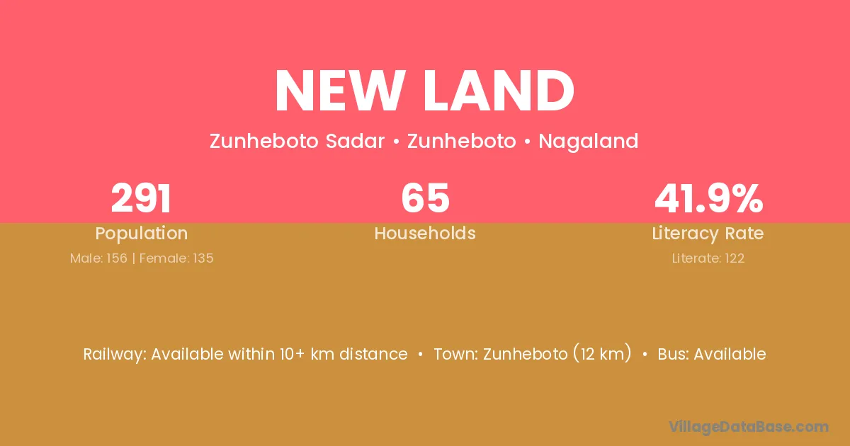 Zunheboto (12 km) is the nearest town to New Land village for major economic activities and is located approximately 12 km away.